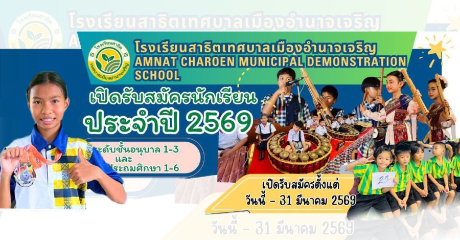 โรงเรียนสาธิตเทศบาลเมืองอำนาจเจริญ รับสมัครนักเรียน อนุบาล 1 (อายุ 3 ขวบ) และ ป.1 ประจำปีการศึกษา 2569