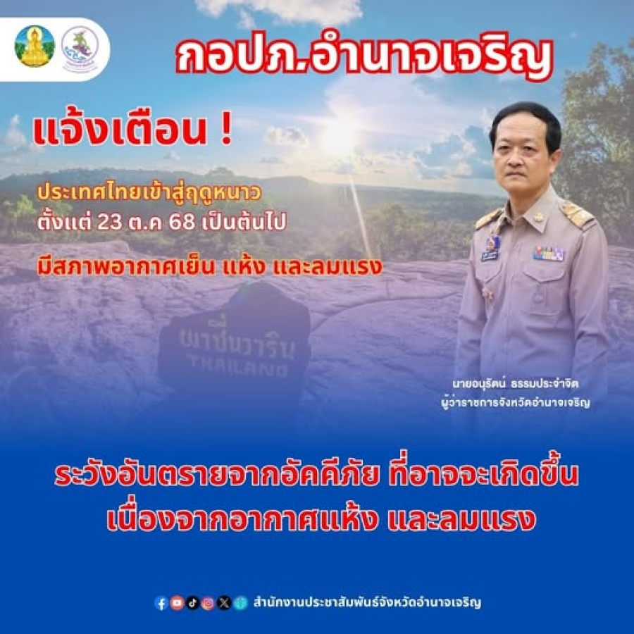 กอปภ.จ.อำนาจเจริญ แจ้งเตือน! ตั้งแต่วันที่ 23 ต.ค.2568 เป็นต้นไป ประเทศไทยเข้าสู่ฤดูหนาว มีอากาศเย็น แห้ง และลมแรง