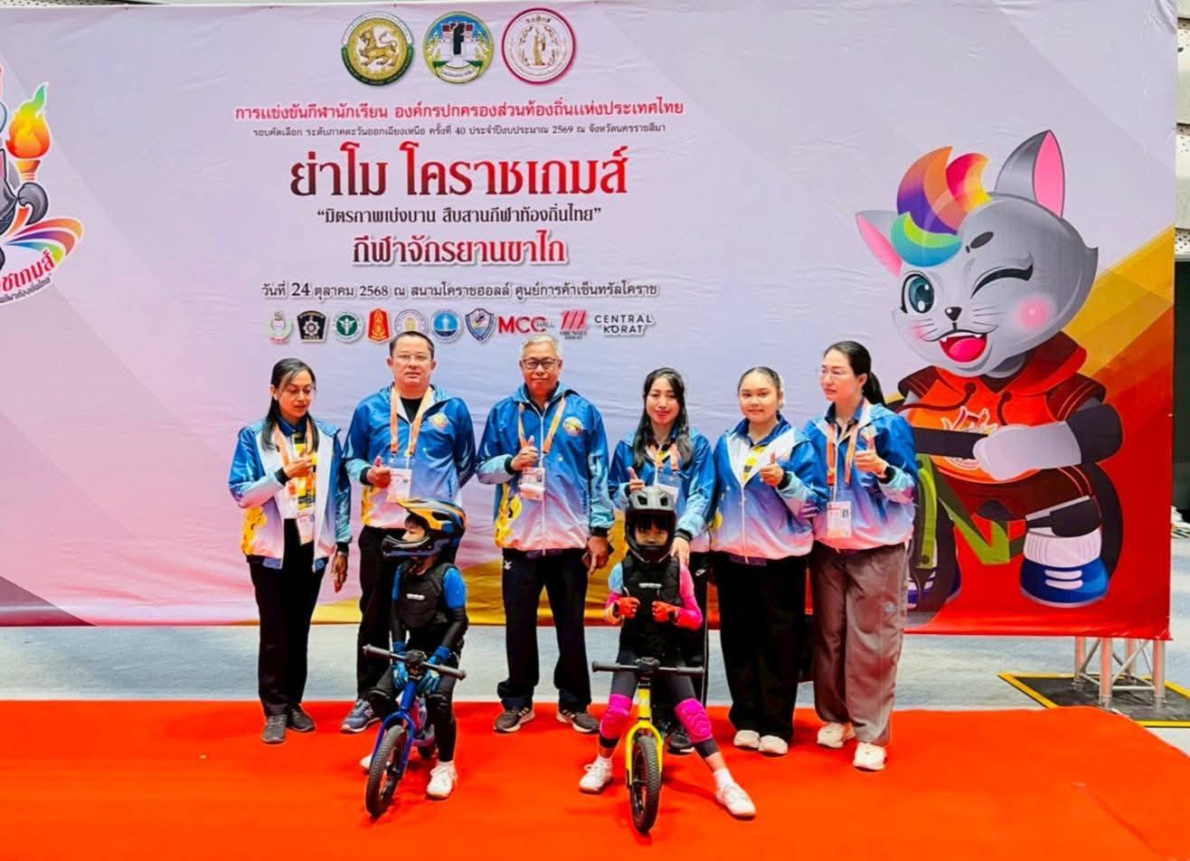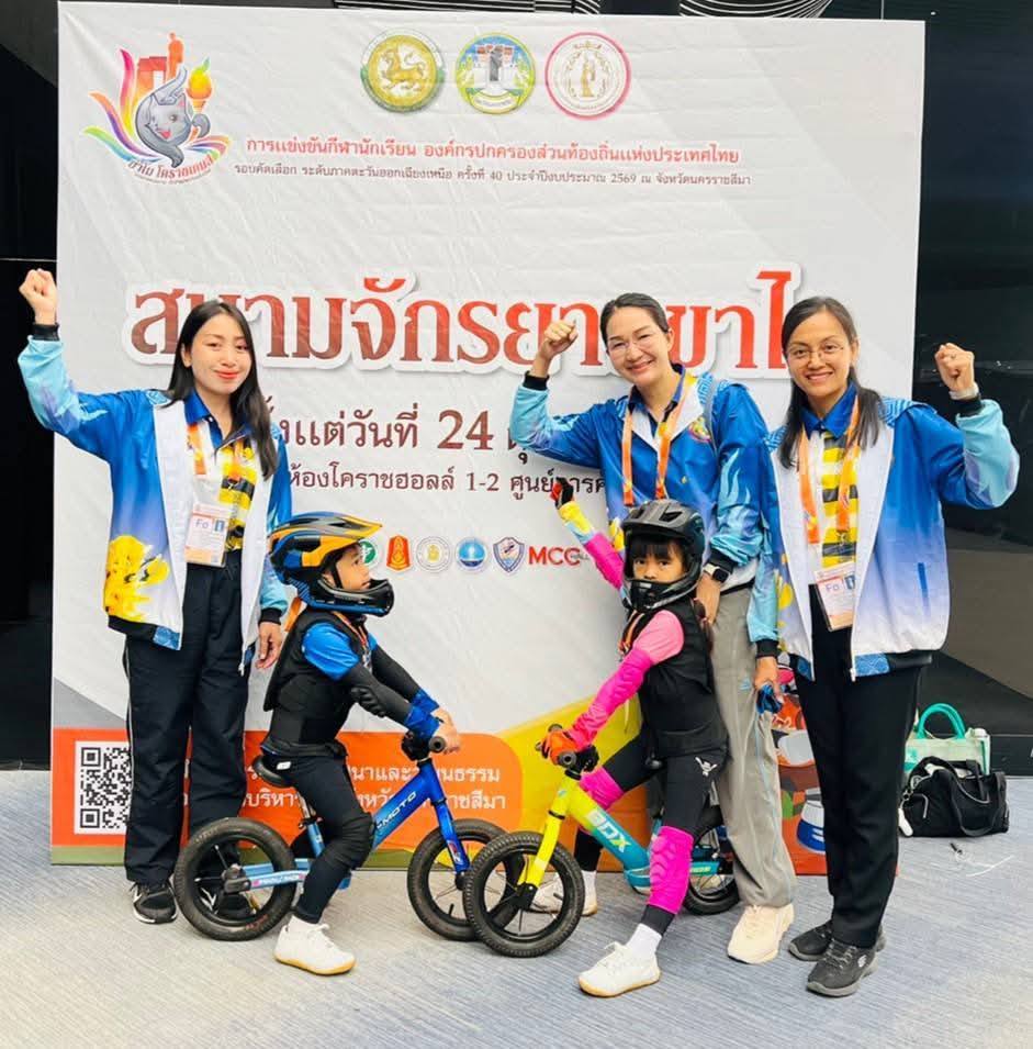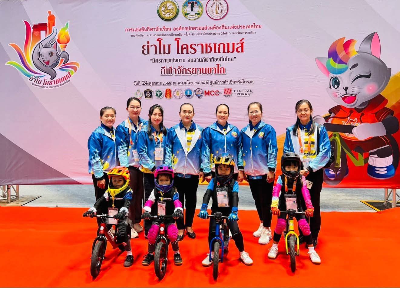 ทีมกีฬาจักรยานขาไถ รุ่นอายุ 6 ปี ร่วมการแข่งขันที่สนามแข่งขันห้างเซ็นทรัลนครราชสีมา อำเภอเมืองนครราชสีมา จังหวัดนครราชสีมา การแข่งขันกีฬานักเรียนองค์กรปกครองส่วนท้องถิ่นแห่งประเทศไทย ครั้งที่ 40 ประจำปีงบประมาณ 2569 รอบคัดเลือก ภาคตะวันออกเฉียงเหนือ "ย่าโม โคราชเกมส์" ณ จังหวัดนครราชสีมา นักกีฬา น้องปิ่น ด.ญ.ณัฐกฤตา วุฒิเศลา อ.3 น้องเจ้าคุณ ด.ช.จักรทิพย์ แผนมะหิงษ์ อ.3 ครูผู้ฝึกสอน น.ส.เกศราภรณ์ ปรากฎ น.ส.ธิมากร เกษมสุข น.ส.ประนอม ชิวหะ