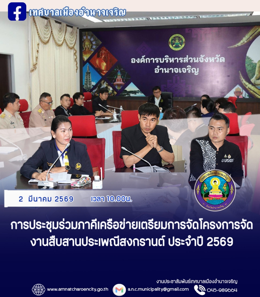 นายถวัลย์ นิยมพานิชพัฒนา นายกเทศมนตรีเมืองอำนาจเจริญ พร้อมด้วย นางจีระนัน ศรีสุวรรณ รองนายกเทศมนตรีเมืองอำนาจเจริญ นายณฐกร วรรณะวัลย์ รองนายกเทศมนตรีเมืองอำนาจเจริญ หัวหน้าส่วนราชการ และเจ้าหน้าที่ผู้เกี่ยวข้อง เข้าร่วมการประชุมร่วมภาคีเครือข่ายเตรียมการจัดโครงการจัดงานสืบสานประเพณีสงกรานต์ ประจำปี 2569 ทั้งนี้ เพื่อร่วมหารือแนวทางเตรียมการจัดโครงการจัดงานสืบสานประเพณีสงกรานต์ ประจำปี 2569