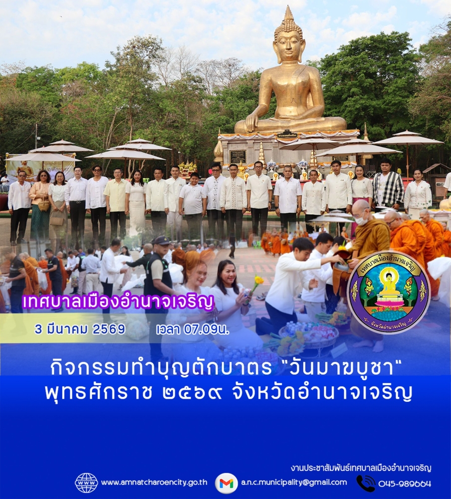 นายถวัลย์ นิยมพานิชพัฒนา นายกเทศมนตรีเมืองอำนาจเจริญ พร้อมด้วย คณะผู้บริหารเทศบาลเมืองอำนาจเจริญ สมาชิกสภาเทศบาลเมืองอำนาจเจริญ หัวหน้าส่วนราชการ ข้าราชการ และบุคลากรในสังกัดเทศบาลเมืองอำนาจเจริญ รวมไปถึงพุทธศาสนิกชนชาวจังหวัดอำนาจเจริญและพื้นที่ใกล้เคียง เข้าร่วมกิจกรรมทำบุญตักบาตร “วันมาฆบูชา” พุทธศักราช ๒๕๖๙ จังหวัดอำนาจเจริญ โดยมี นายเสนีย์ ส้มเขียวหวาน ผู้ว่าราชการจังหวัดอำนาจเจริญ เป็นประธานฝ่ายฆราวาส ในส่วนของพิธีทางพระพุทธศาสนา มีพระครูถาวรศาสนคุณ เจ้าคณะจังหวัดอำนาจเจริญ (ธ) เป็นประธานฝ่ายสงฆ์ ทั้งนี้ วันมาฆบูชา เป็นวันที่พระสัมมาสัมพุทธเจ้าทรงแสดง "โอวาทปาติโมกข์"แก่พระสงฆ์เป็นครั้งแรก หลังจากตรัสรู้มาแล้วเป็นเวลาเก้าเดือน ซึ่งหลักคำสอนนี้เป็นหลักการ และวิธีการปฏิบัติต่างๆ หากสรุปเป็นใจความสำคัญ จะมีเนื้อหาว่า "ทำความดี ละเว้นความชั่ว ทำจิตใจให้บริสุทธิ์"