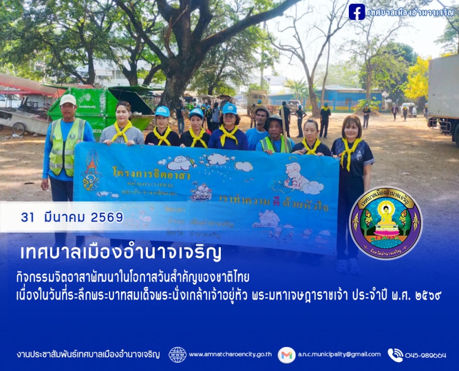 นายถวัลย์ นิยมพานิชพัฒนา นายกเทศมนตรีเมืองอำนาจเจริญ มอบหมายให้หัวหน้าส่วนราชการ ข้าราชการ และเจ้าหน้าที่ในสังกัดเทศบาลเมืองอำนาจเจริญ เข้าร่วมกิจกรรมจิตอาสาพัฒนาในโอกาสวันสำคัญของชาติไทย เนื่องในวันที่ระลึกพระบาทสมเด็จพระนั่งเกล้าเจ้าอยู่หัว พระมหาเจษฎาราชเจ้า ประจำปี พ.ศ. ๒๕๖๙ ซึ่งศูนย์อำนวยการจิตอาสาพระราชทาน จังหวัดอำนาจเจริญ ได้กำหนดแนวทางการดำเนินกิจกรรมจิตอาสาพัฒนาในโอกาสวันสำคัญของชาติไทย บูรณาการความร่วมมือกับส่วนราชการ หน่วยงานรัฐวิสาหกิจ ภาคเอกชน สถาบันการศึกษา องค์กรปกครองส่วนท้องถิ่น และประชาชนในพื้นที่ ร่วมกิจกรรมการทำความสะอาดบริเวณตลาดสดเทศบาล ๑ (ตลาดเช้า) อำเภอเมืองอำนาจเจริญ จังหวัดอำนาจเจริญ เนื่องในวันที่ระลึกพระบาทสมเด็จพระนั่งเกล้าเจ้าอยู่หัว พระมหาเจษฎาราชเจ้า ประจำปี พ.ศ. ๒๕๖๙ ณ บริเวณตลาดสดเทศบาล ๑ (ตลาดเช้า) อำเภอเมืองอำนาจเจริญ จังหวัดอำนาจเจริญ