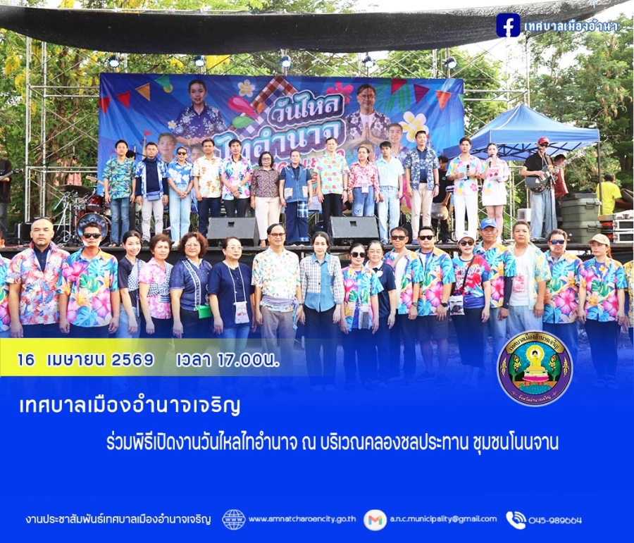 นายถวัลย์ นิยมพานิชพัฒนา นายกเทศมนตรีเมืองอำนาจเจริญ พร้อมด้วย คณะผู้บริหารเทศบาลเมืองอำนาจเจริญ สมาชิกสภาเทศบาลเมืองอำนาจเจริญ หัวหน้าส่วนราชการ ข้าราชการ บุคลากรในสังกัดเทศบาลเมืองอำนาจเจริญ เข้าร่วมในพิธีเปิดงานวันไหลไทอำนาจ โดยมี นางญาณีนาถ เข็มนาค สมาชิกสภาผู้แทนราษฎรจังหวัดอำนาจเจริญ เขต ๒ พรรคภูมิใจไทย เป็นประธานในการเปิดงาน ซึ่งภายในงานมีเวทีการแสดงของศิลปินนักร้อง อาทิเช่น เบิ้ล ปทุมราช / จ๋า สุนารี ศรีนคร / ธาม ธนา สายรักษ์ เป็นต้น บรรยากาศภายในงานเต็มไปด้วยความสนุกสนาน มีผู้คนจำนวนมากมาร่วมชมการแสดงบนเวทีและลงเล่นน้ำในคลองชลประทานเพื่อเป็นการส่งท้ายประเพณีสงกรานต์ ประจำปี ๒๕๖๙ ของจังหวัดอำนาจเจริญ ณ บริเวณคลองชลประทาน ชุมชนโนนจาน ตำบลบุ่ง อำเภอเมืองอำนาจเจริญ จังหวัดอำนาจเจริญ